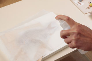 ④ パフを押し当て紙にシワが出ない様に貼ります。